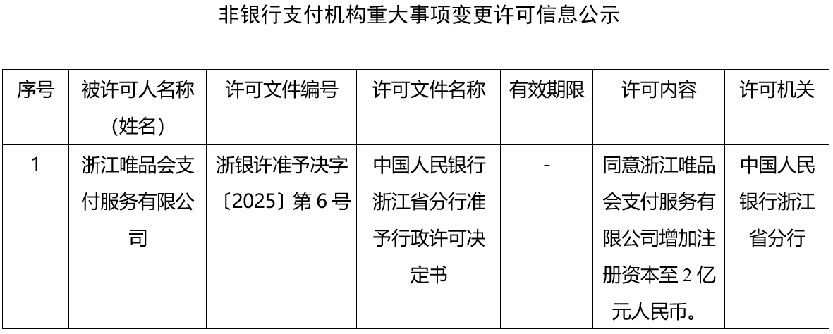 据移动支付网了解,10月11日,中国人民银行浙江省分行非银行支付机构重大事项变更许可决定信息公示表显示,同意浙江唯品会支付服务有限公司增加注册资本至2亿元人民币。