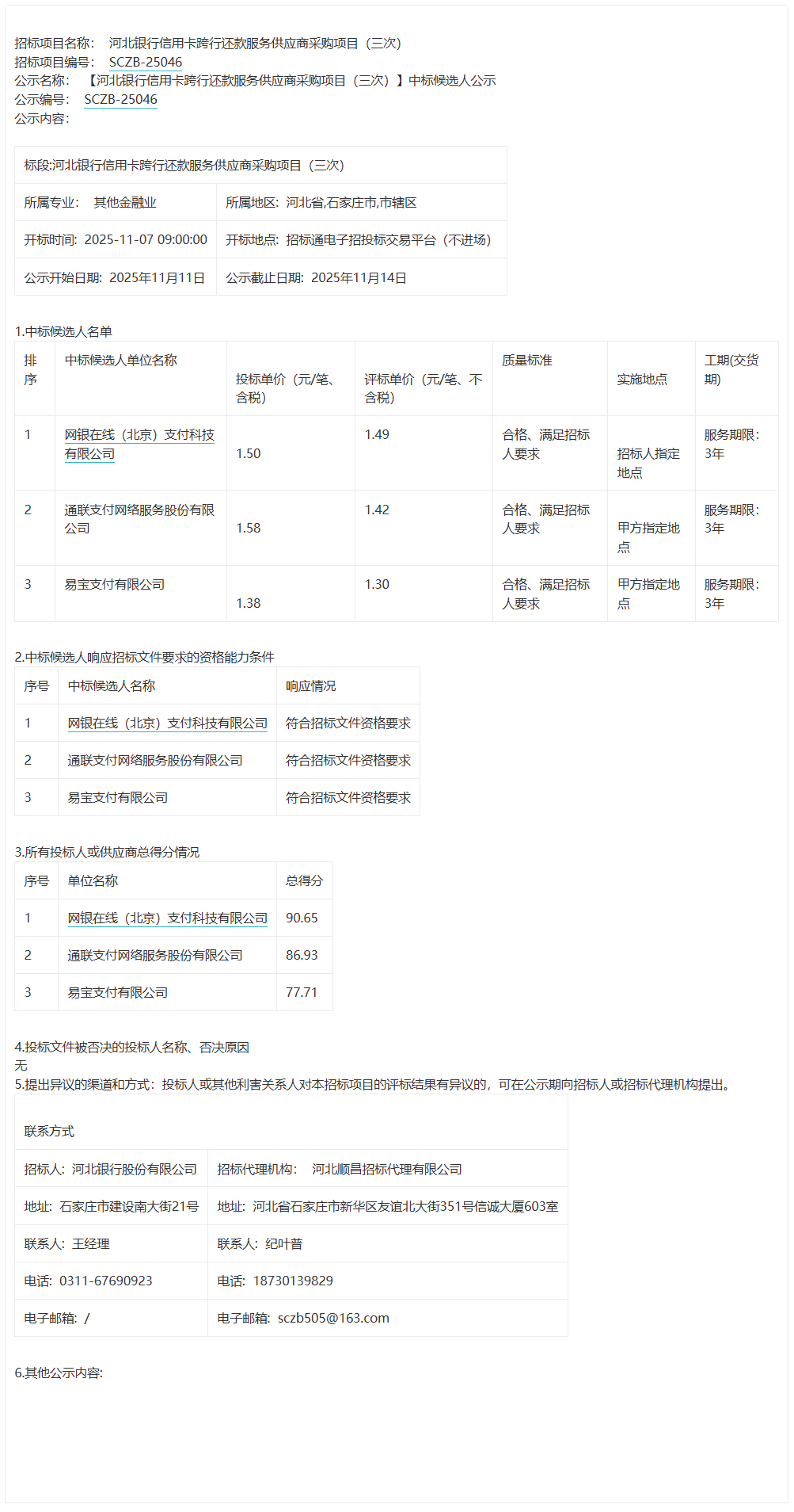 河北银行信用卡跨行还款服务供应商采购项目中标候选人公示