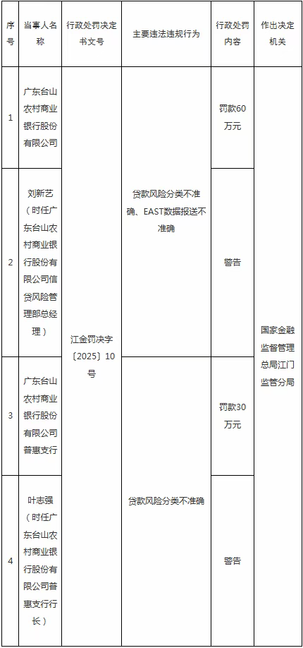 10月,国家金融监督管理总局江门监管分局发布的行政处罚信息显示,广东台山农商银行因“贷款风险分类不准确、EAST数据报送不准确”等主要违法违规行为,被罚款60万元。同时,时任该行信贷风险管理部总经理刘新艺被警告。