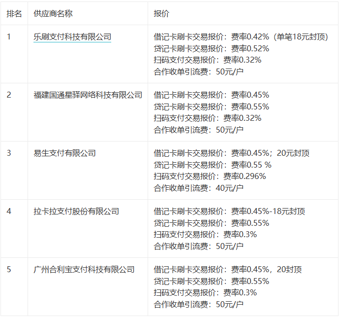 招标内容:确定5家中标供应商进行合作收单项目合作