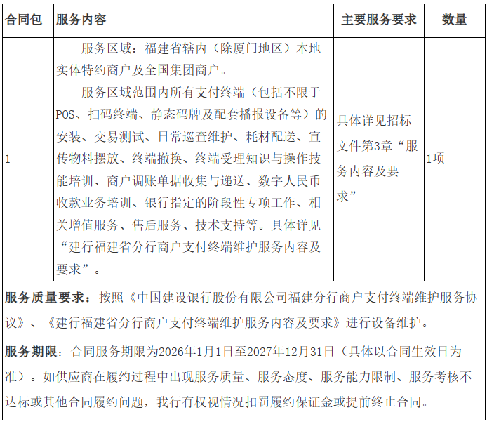 建行福建省分行2026-2027年全省收单商户维护服务项目招标