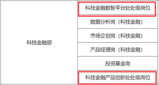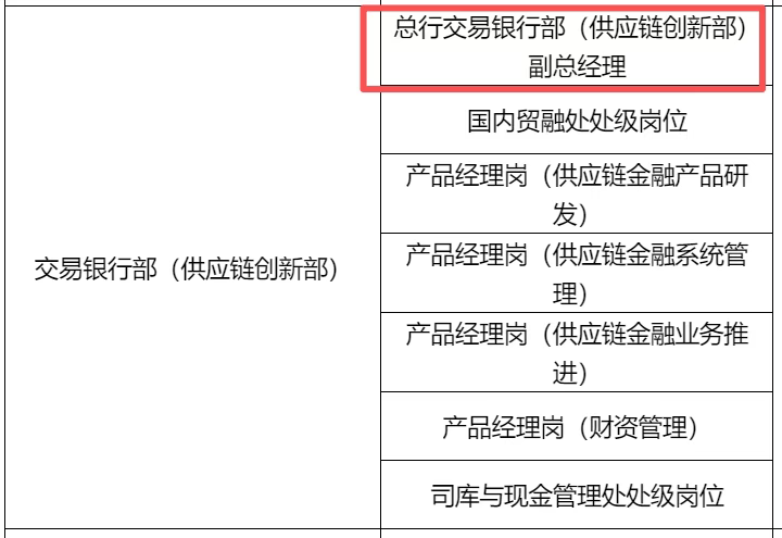 在近期的招募岗位中,包括总行交易银行部(供应链创新部)副总经理一职,该岗位职责包括“牵头推进部门中各业务系统的建设”;科技金融部则招募包括数智平台处处级岗位、产品创新处处级岗位。