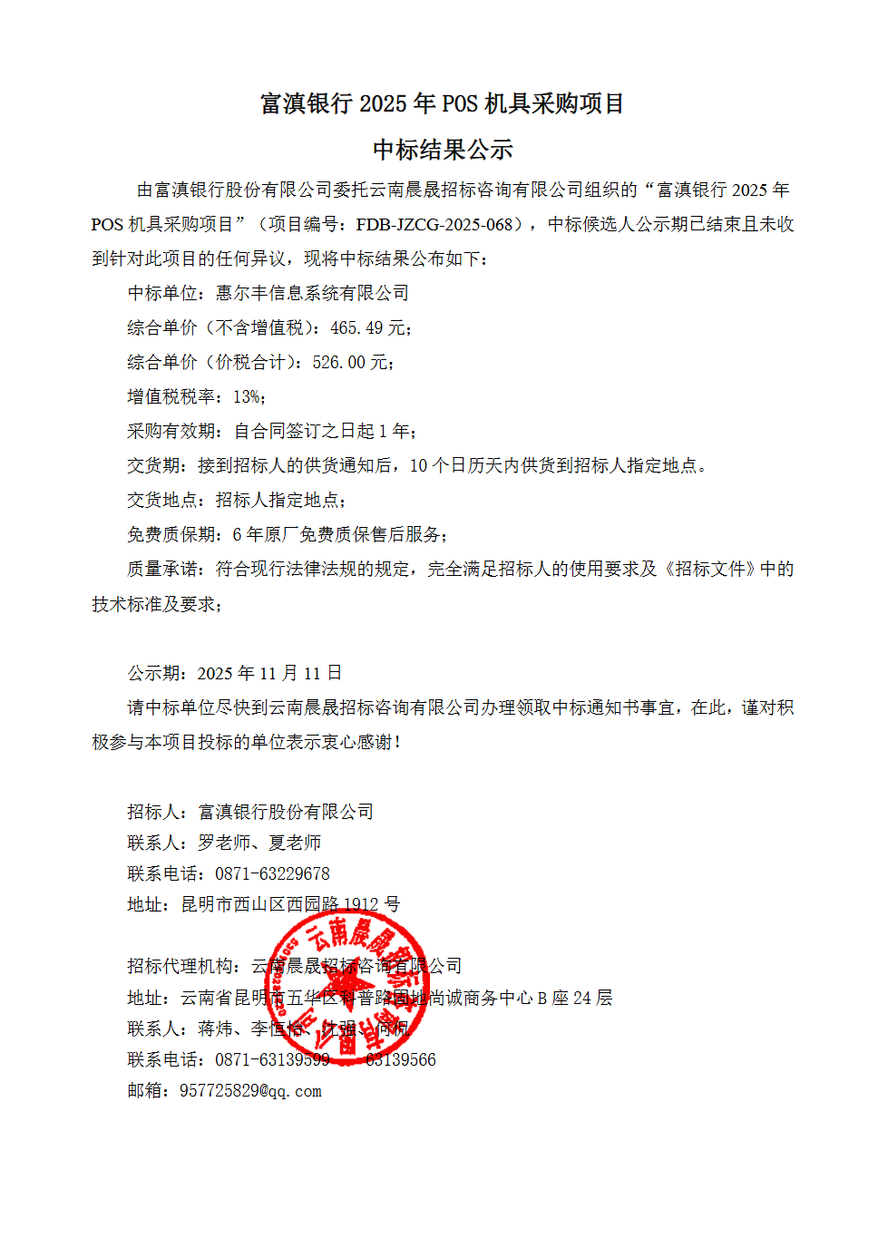 富滇银行智慧商户结算平台建设项目中标候选人公示