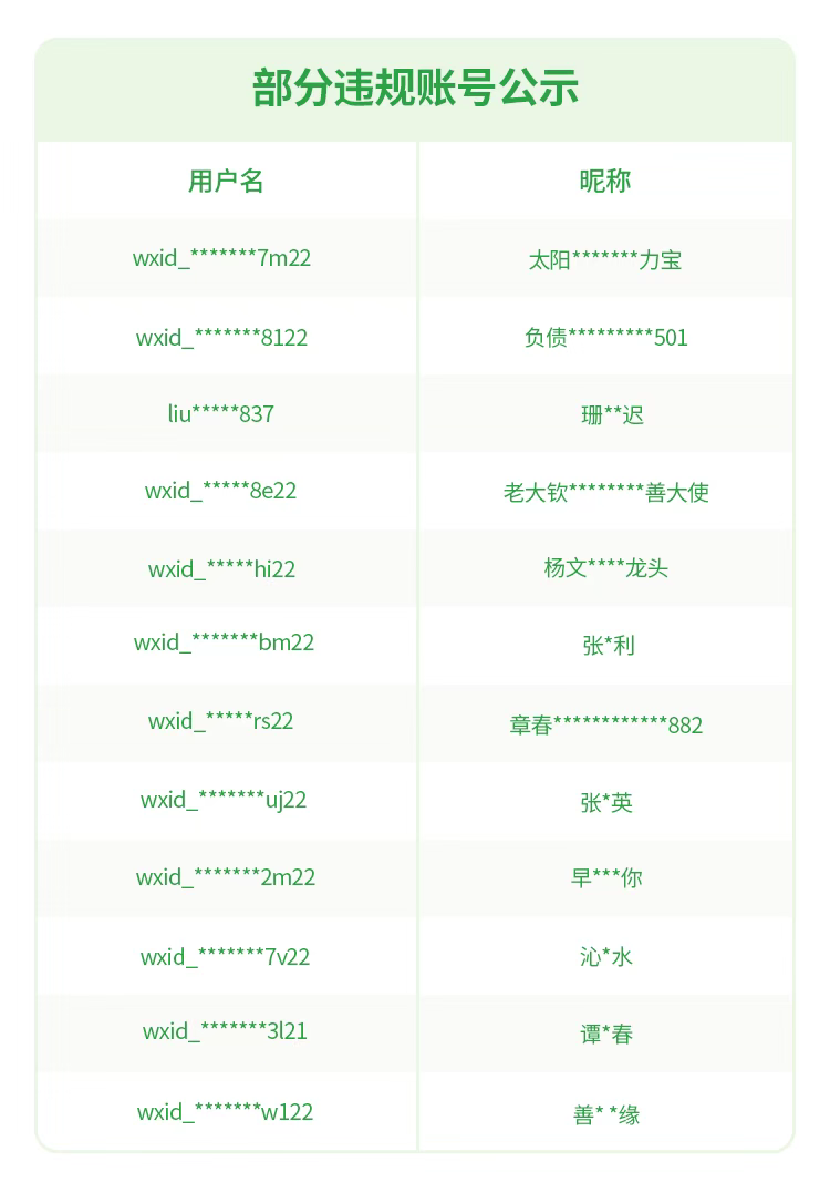 上述行为一经发现核实,平台将依据国家相关法律法规以及《腾讯微信软件许可及服务协议》《微信个人账号使用规范》等平台协议及规则,视违规严重程度对相关账号进行阶梯式处理,多次违规者有可能永久限制登录,对确认违规的微信群,进行停用群功能处理。