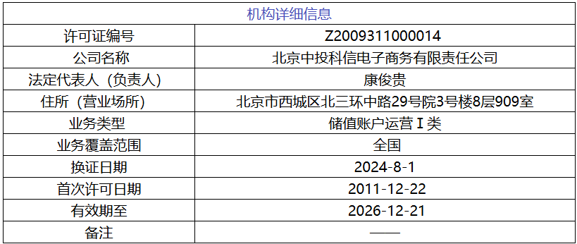 据移动支付网了解,中投科信成立于2012年,注册资金1.11亿。中投科信2011年获得央行首批颁发的《支付业务许可证》并于2016年、2021年两次成功续展支付牌照,业务类型为互联网支付(全国)。随着支付业务类型重新划分,其业务类型已变更为“储值账户运营Ⅰ类”。