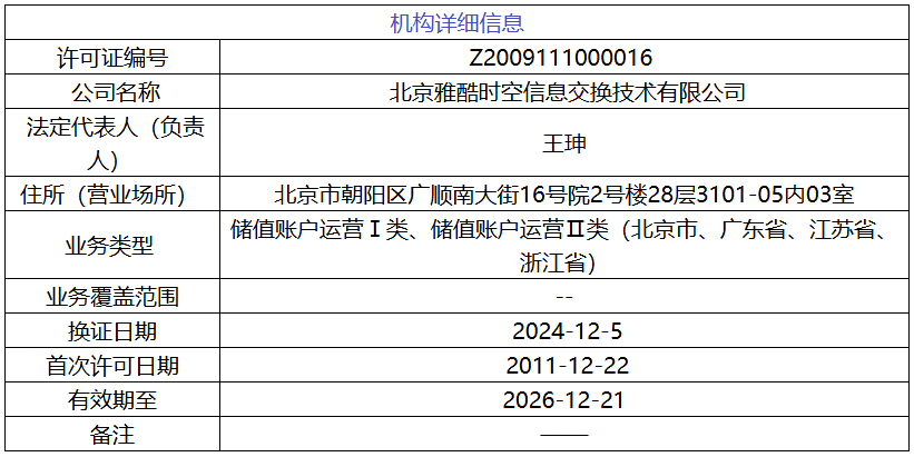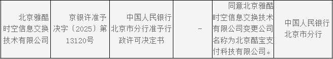 中国人民银行北京市分行非银行支付机构重大事项变更许可信息公示(2025年11月14日)显示,同意北京雅酷时空信息交换技术有限公司变更公司名称为北京酷宝支付科技有限公司(下称“酷宝支付”)。