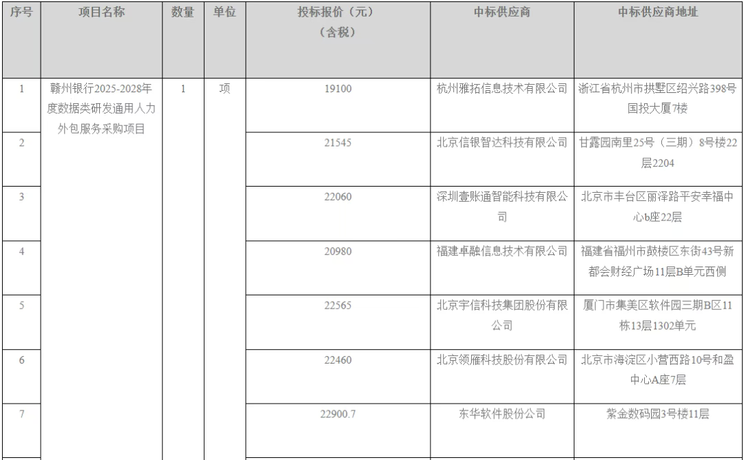 赣州银行2025-2028年度数据类研发通用人力外包服务采购项目中标供应商公示