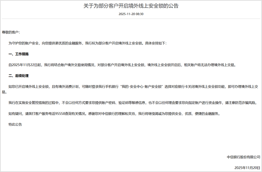 11月20日消息,中信银行发布公告称,为守护客户的账户安全,向客户提供更优质的金融服务,该行自2025年11月22日起,将结合账户境外交易使用情况,对部分客户开启境外线上安全锁,境外线上安全锁开启后,相关账户将无法办理境外线上交易。如客户已开启境外线上安全锁,且有境外消费计划,可随时登录该行手机银行“我的-安全中心-账户安全锁”选择对应银行卡关闭境外线上安全锁功能,即可办理境外线上交易。