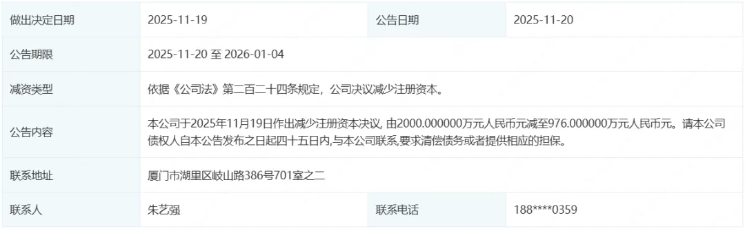 然而有意思的是,几乎在发布严正声明的同时,在工商层面,顶佰熠还发布了企业减少注册资本的公告。根据公告,顶佰熠注册资本将由2000万减至976万,还请债权人自公告发布起45日内与公司联系,要求清偿债务或者提供相应的担保。