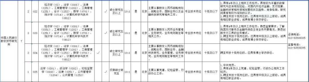 第三个岗位主要从事数字人民币战略规划、战略合作、国际业务、金融科技研究、业务管理、业务研究、业务规则制定等相关工作。要求:聘至专技十级岗位的,应具有博士学历学位。