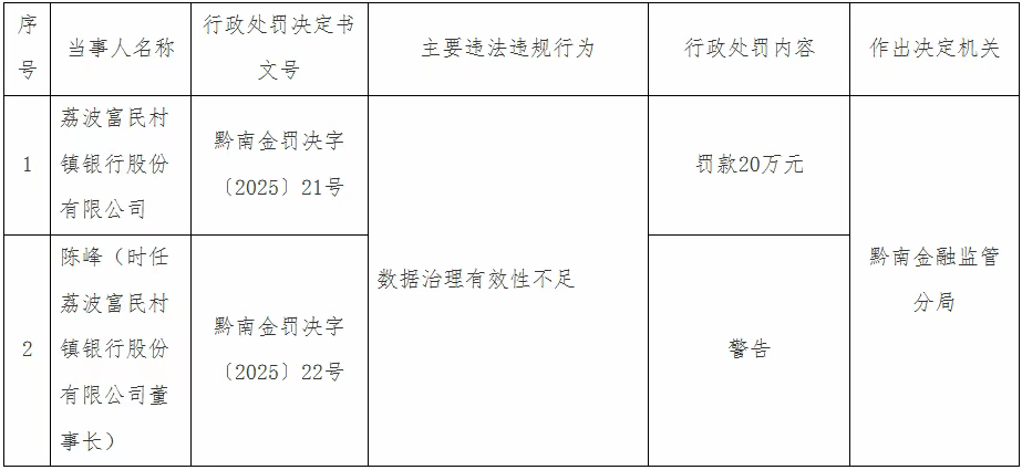 10月31日,国家金融监督管理总局黔南监管分局发布的行政处罚信息显示,荔波富民村镇银行因“数据治理有效性不足”这一项主要违法违规行为,被罚款20万元。同时,时任该行董事长陈峰被警告。