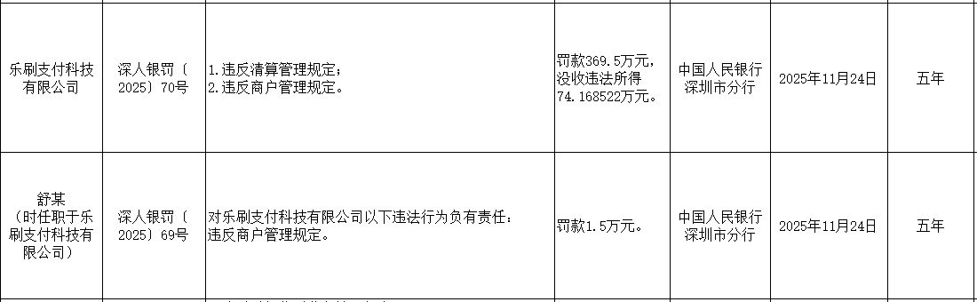 11月28日消息,中国人民银行深圳市分行发布新罚单,乐刷支付科技有限公司因“违反清算管理规定、违反商户管理规定”被罚款369.5万元,没收违法所得74.168522万元。
