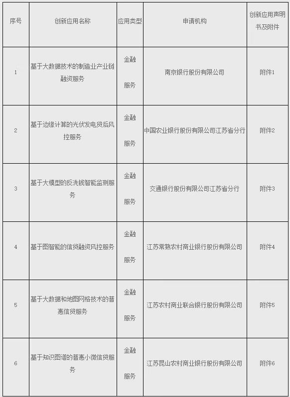 该批次金融科技创新应用聚焦数字金融,涉及大数据、机器学习、自然语言处理、物联网、边缘计算、光学字符识别、多模态大模型、图算法、图神经网络、远程视频、电子签章、知识图谱等技术,申请机构均为银行,包括农行、交行、南京银行、江苏农商联合银行、常熟农商银行、昆山农商银行。