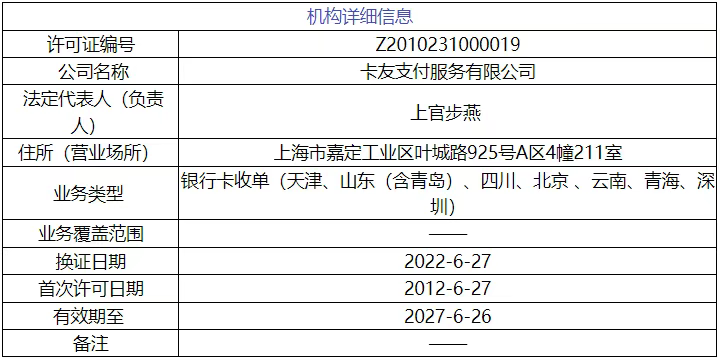 据移动支付网了解,卡友支付成立于2003年,并在2012年6月28日获得《支付业务许可证》,获准开展银行卡收单业务。值得注意的是,根据央行官网的支付牌照信息,目前大部分牌照有效的支付机构都已进行了业务类型变更,但是卡友支付不在其中。虽然卡友支付的牌照续展后仍在有效期内,但它并没和大多数支付机构那样完成“换证”,支付业务类型仍为“银行卡收单(天津、山东(含青岛)、四川、北京、云南、青海、深圳)”。因为这家支付机构尚有大量问题亟需厘清,其中就包括股权转让等一系列内容。