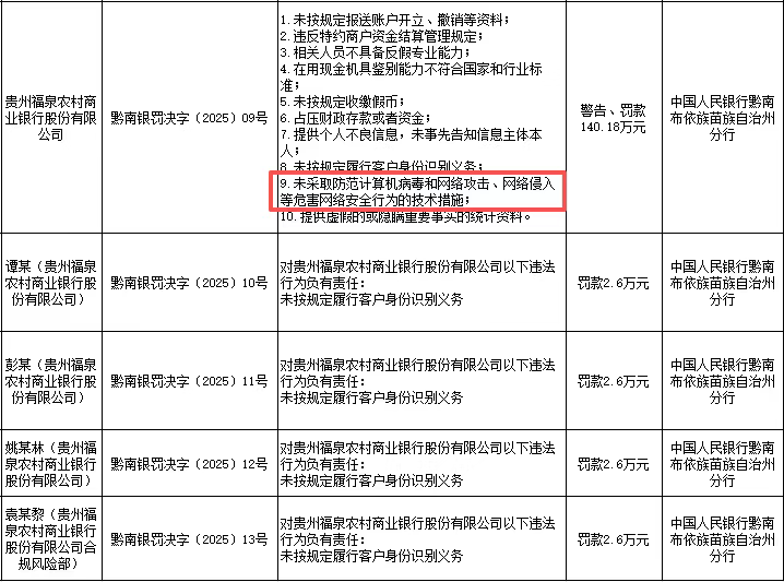 未采取防范危害网络安全行为的技术措施,福泉农商银行被罚