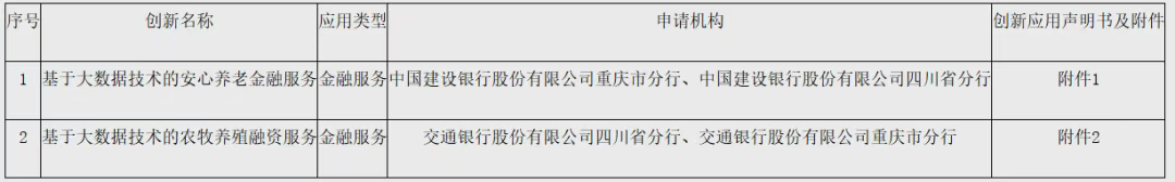 该批次金融科技创新应用聚焦养老金融、普惠金融,运用大数据、物联网、人工智能等技术,申请机构均为银行,建行、交行均为重庆市、四川省两地机构联合申请。