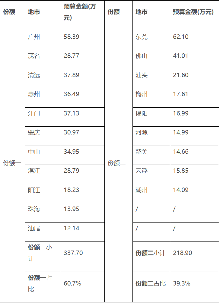 2.3 项目预算及份额划分:556.6万元(含税),项目初期将全省20家二级分行划分为两个份额,原则上由综合评分排名第一、第二的中标人,按其投标意向依次选择服务份额并承接对应的初期服务地市。如合同期内存在中标人退出的情况,其服务地市及剩余预算份额可由另一中标人按自身投标价格承接,或由甲方重新招标。
