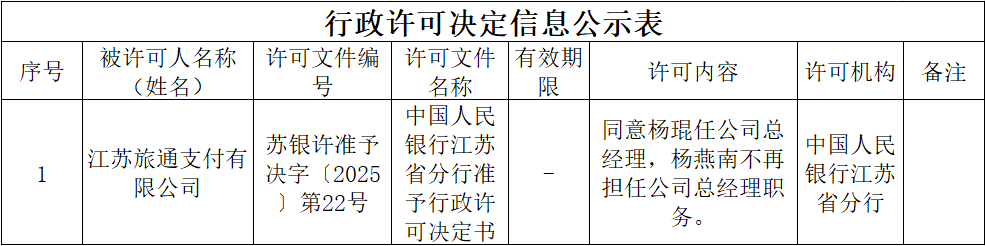 中国人民银行江苏省分行非银行支付机构变更事项信息公示表(2025年12月15日),同意杨琨任江苏旅通支付有限公司(下称“旅通支付”)总经理,杨燕南不再担任公司总经理职务。