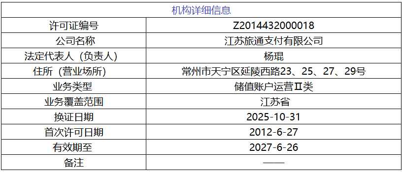 据移动支付网了解,旅通支付成立于2011年,注册资金为1亿元。总部位于江苏常州,由常州投资集团有限公司、龙城产业投资控股集团有限公司和常州信辉商业保理有限公司三家共同出资,专营江苏省内预付卡发行与受理业务。于2012年获中国人民银行颁发的《支付业务许可证》,随即开展支付业务,并于2022年续牌成功。2024年支付业务类型调整后,旅通支付业务类型调整为“储值账户运营Ⅱ类”,业务覆盖范围为江苏省。