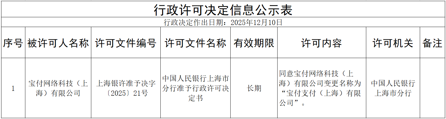 中国人民银行上海市分行非银行支付机构变更事项许可信息公示表(2025年12月10日)显示,同意宝付网络科技(上海)有限公司变更名称为“宝付支付(上海)有限公司”(下称“宝付”)。