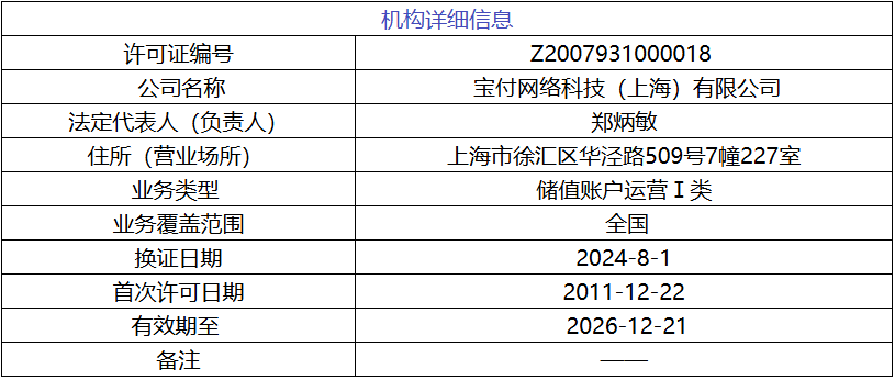 据移动支付网消息,宝付成立于2011年,同年荣获由中国人民银行颁发的《支付业务许可证》,中国人民银行准许其在全国范围内开展互联网支付业务。2024年支付业务类型调整后,宝付业务类型调整为“储值账户运营Ⅰ类”。