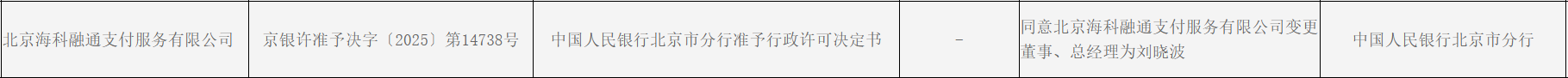 中国人民银行北京市分行非银行支付机构重大事项变更许可信息公示(2025年12月22日)显示,同意北京海科融通支付服务有限公司(下称“海科融通”)变更董事、总经理为刘晓波。