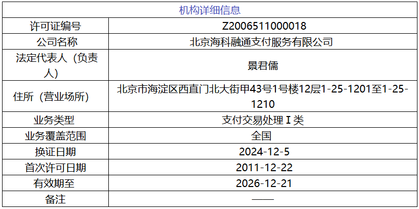 公开资料显示,海科融通成立于2001年,于2011年获得《支付业务许可证》,中国人民银行准许其在全国范围内开展银行卡收单业务。2024年《非银行支付机构监督管理条例》实施后,业务类型更新为“支付交易处理Ⅰ类”。