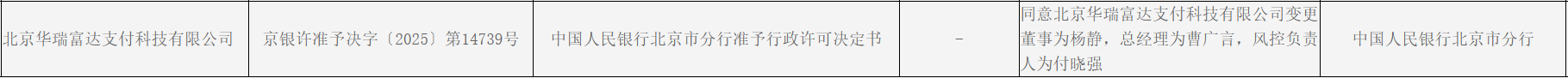 中国人民银行北京市分行非银行支付机构重大事项变更许可信息公示(2025年12月22日)显示,同意北京华瑞富达支付科技有限公司(下称“华瑞支付”)变更董事为杨静,总经理为曹广言,风控负责人为付晓强。