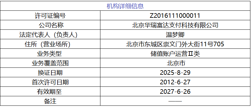 据移动支付网了解,华瑞支付成立于2007年,并于2012年获得由中国人民银行颁发的《支付业务许可证》,获准在北京市范围内开展预付卡发行与受理业务。2022年6月,华瑞支付牌照续展成功,随着支付业务类型重新划分,其业务类型已变更为“储值账户运营Ⅱ类”。