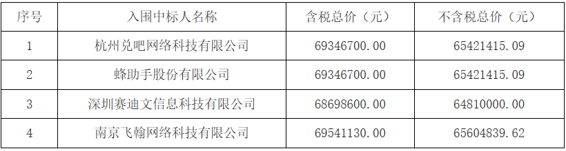 七、投标企业:福州微联达传媒有限公司、南京飞翰网络科技有限公司、南京华脉科技股份有限公司、杭州兑吧网络科技有限公司、北京众联享付科技股份有限公司、蜂助手股份有限公司、深圳市年年卡网络科技有限公司、山东鼎信数字科技有限公司、北京易通峰联信息技术有限公司、广东玄润数字信息科技股份有限公司、易点生活电子商务有限公司、北京汇智启点文化传播有限公司、深圳赛迪文信息科技有限公司。