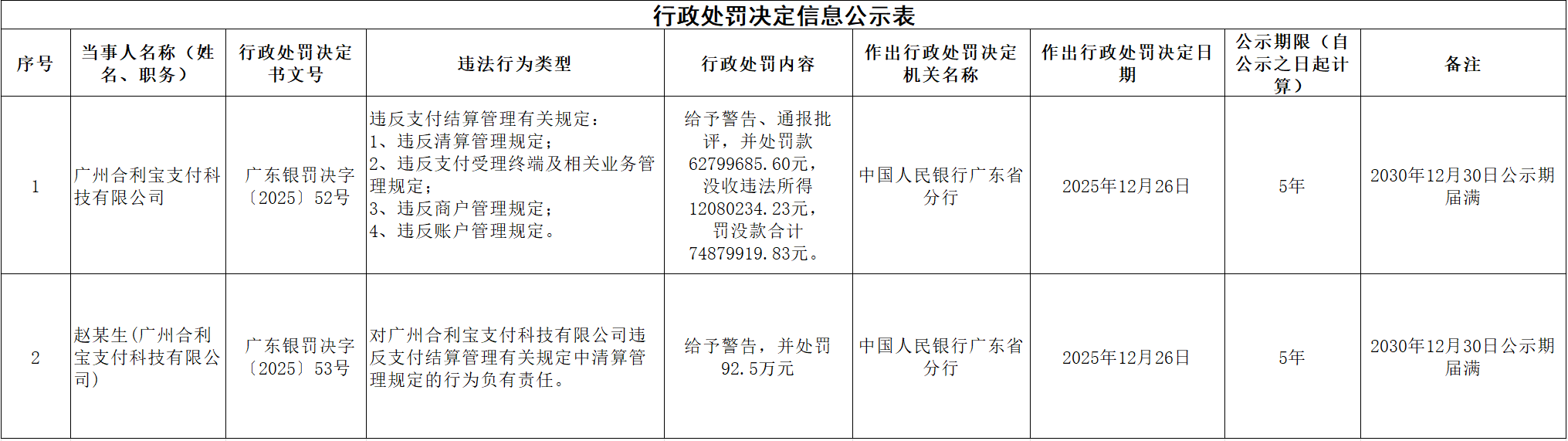 12月31日消息,中国人民银行广东省分行发布新罚单,广州合利宝支付科技有限公司(下称“合利宝”)因“违反清算管理规定、违反支付受理终端及相关业务管理规定、违反商户管理规定、违反账户管理规定”四项违法行为被给予警告、通报批评,并罚款62799685.60元,没收违法所得12080234.23元,罚没款合计74879919.83元。同时,合利宝赵某生被给予警告并罚款92.5万元。