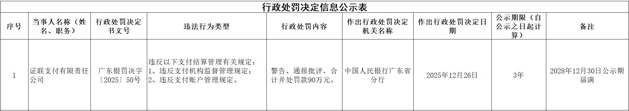 12月31日消息,中国人民银行广东省分行发布新罚单,证联支付有限责任公司(下称“证联支付”)因“违反支付机构监督管理规定、违反支付账户管理规定”两项违法行为被警告、通报批评,合计并处罚款90万元。