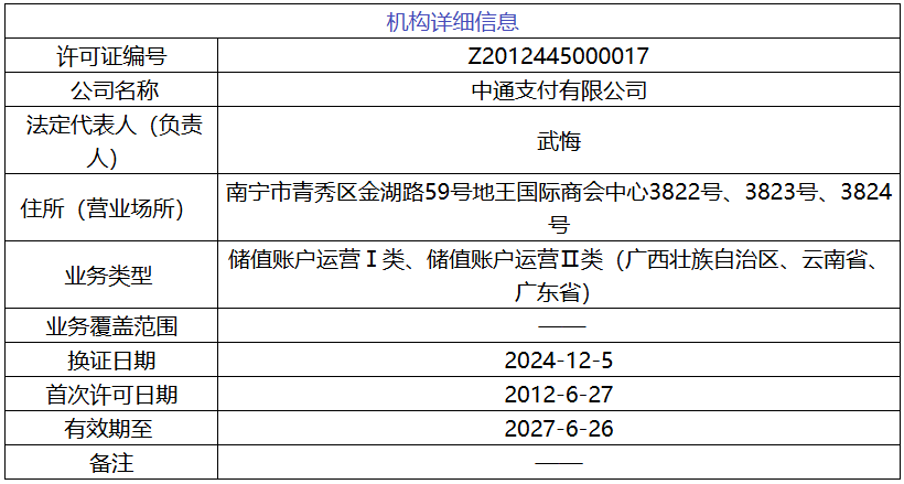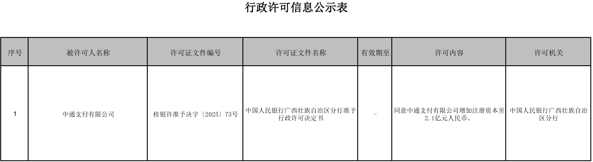 中国人民银行广西壮族自治区分行行政许可信息公示表(2025.12.31)显示,同意中通支付有限公司(下称“中通支付”)增加注册资本至2.1亿元人民币。