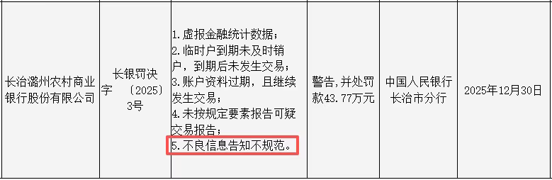 因不良信息告知不规范等,长治潞州农商银行被罚