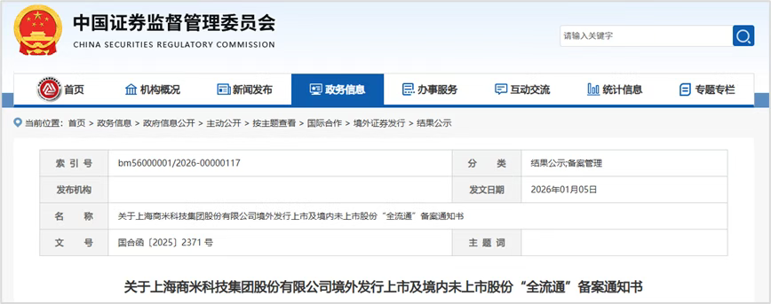 近日,中国证监会发布《关于上海商米科技集团股份有限公司境外发行上市及境内未上市股份“全流通”备案通知书》。