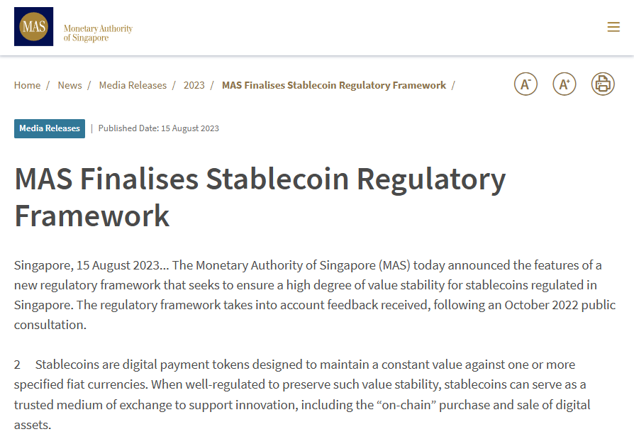 在稳定币的交易,转账,收单和托管服务功能上,由于稳定币专门法规还未发行,仍依新加坡于2023年发布的《稳定币监管框架》被视为一种特别的数字支付货币,目前仍适用PSA下有关DPT的相关规定。