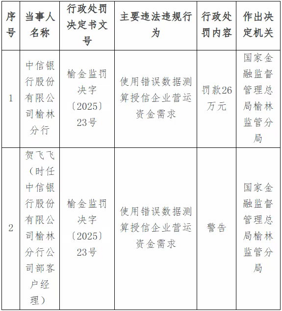 近日,金融监管总局榆林监管分局发布的行政处罚信息显示,中信银行榆林分行因“使用错误数据测算授信企业营运资金需求”,被罚款26万元。