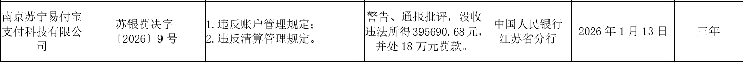 1月22日消息,中国人民银行江苏省分行发布新罚单。南京苏宁易付宝支付科技有限公司因违反账户管理规定、清算管理规定,被没收违法所得395690.68元,并罚款18万元。