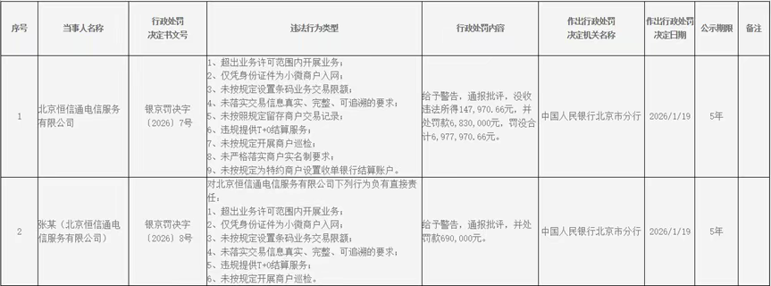 1月24日消息,人民银行北京市分行日前公布的行政处罚决定信息(银京罚决字【2026】7-8号)显示,支付机构北京恒信通电信服务有限公司(简称“恒信通”)因超出业务许可范围内开展业务、仅凭身份证件为小微商户入网、未按规定设置条码业务交易限额、违规提供T+0结算服务等9项违法行为,被警告和通报批评,没收违法所得约14.8元并处罚款683万元,罚没合计近700万元。同时,恒信通张某对其中的部分违法行为负有直接责任,被给予警告,通报批评,并处罚款69万元。