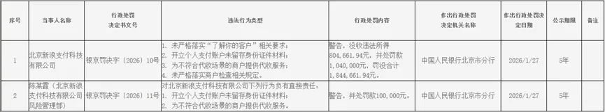 移动支付网1月31日消息,人民银行北京市分行日前公布的行政处罚决定信息(银京罚决字【2026】10-11号)显示,支付机构北京新浪支付科技有限公司(简称“新浪支付”)因未严格落实“了解你的客户”相关要求、开立个人支付账户未留存身份证件材料、为不符合代收场景的商户提供代收服务、未严格落实商户检查相关规定等违法行为,被警告,没收违法所得约80万元,并处罚款104万元,罚没合计超180万元。