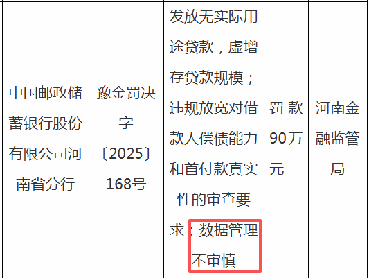 邮储银行河南省分行因“数据管理不审慎”等3项主要违法违规行为,被罚款90万元。