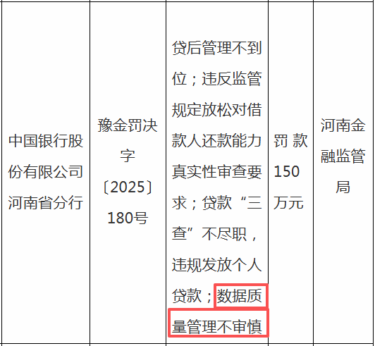 中国银行河南省分行因“数据质量管理不审慎”等4项主要违法违规行为,被罚款150万元。