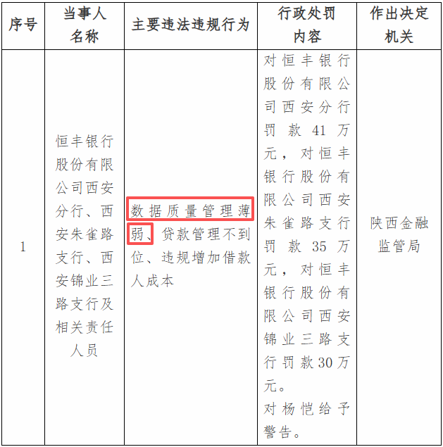 而1月6日,金融监管总局陕西监管局发布的行政处罚信息显示,恒丰银行西安分行、西安朱雀路支行、西安锦业三路支行及相关责任人员因“数据质量管理薄弱”等3项主要违法违规行为被罚。其中,西安分行被罚41万元,2家支行被罚共计65万元。