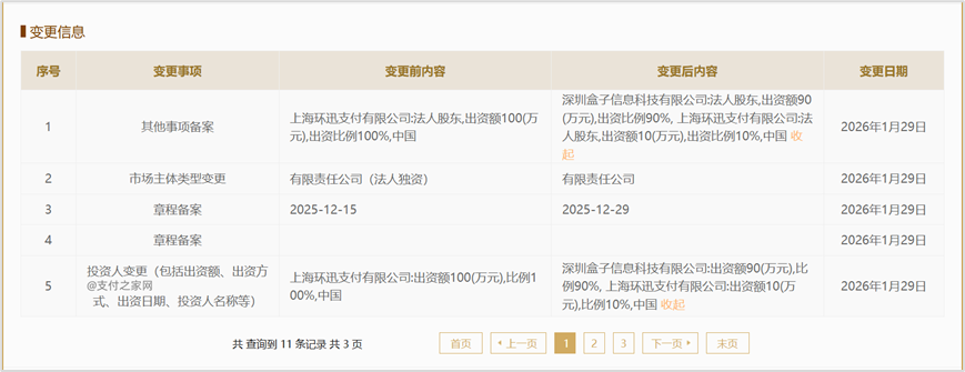 公开信息显示,2026年1月29日,深圳环迅信息技术有限公司完成投资人及市场主体类型变更。原由上海环迅支付有限公司100%持股的股权结构,调整为由深圳盒子信息科技有限公司持股90%,上海环迅支付有限公司持股10%。与此同时,公司市场主体类型由“有限责任公司(法人独资)”变更为“有限责任公司”。