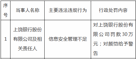 1月9日,金融监管总局上饶监管分局发布的行政处罚信息显示,上饶银行因“信息安全管理不足”,被罚款30万元。同时,相关责任人颜恺被警告。