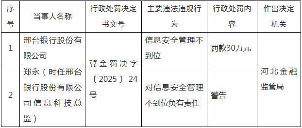 1月6日,金融监管总局河北监管局发布的行政处罚信息显示,邢台银行因“信息安全管理不到位”,被罚款30万元。同时,时任该行信息科技总监郑永对“信息安全管理不到位”负有责任,被警告。