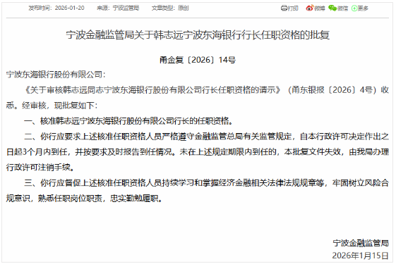 1月20日,宁波金融监管局批复显示,韩志远任宁波东海银行行长的任职资格获批。