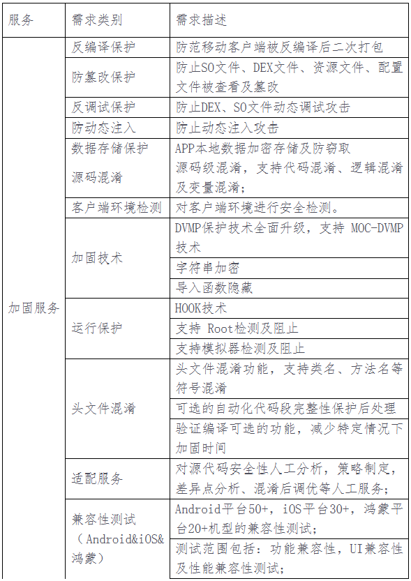 本次采购的移动安全加固服务需与我行已有安全加固服务保持无缝衔接,确保在不影响移动客户端原有功能和用户体验的基础上,提升移动应用的安全防护能力,防止客户端软件遭到恶意篡改代码、恶意添加广告和非法注入调试等攻击,降低风险隐患。此次采购针对我行所有移动客户端(含App、小程序、H5、专用客户端等,不限个数)的各版本应用(包括Android、iOS和鸿蒙三版本)提供加固服务,服务期限为三年,此次采购加固服务需赠送加固平台。