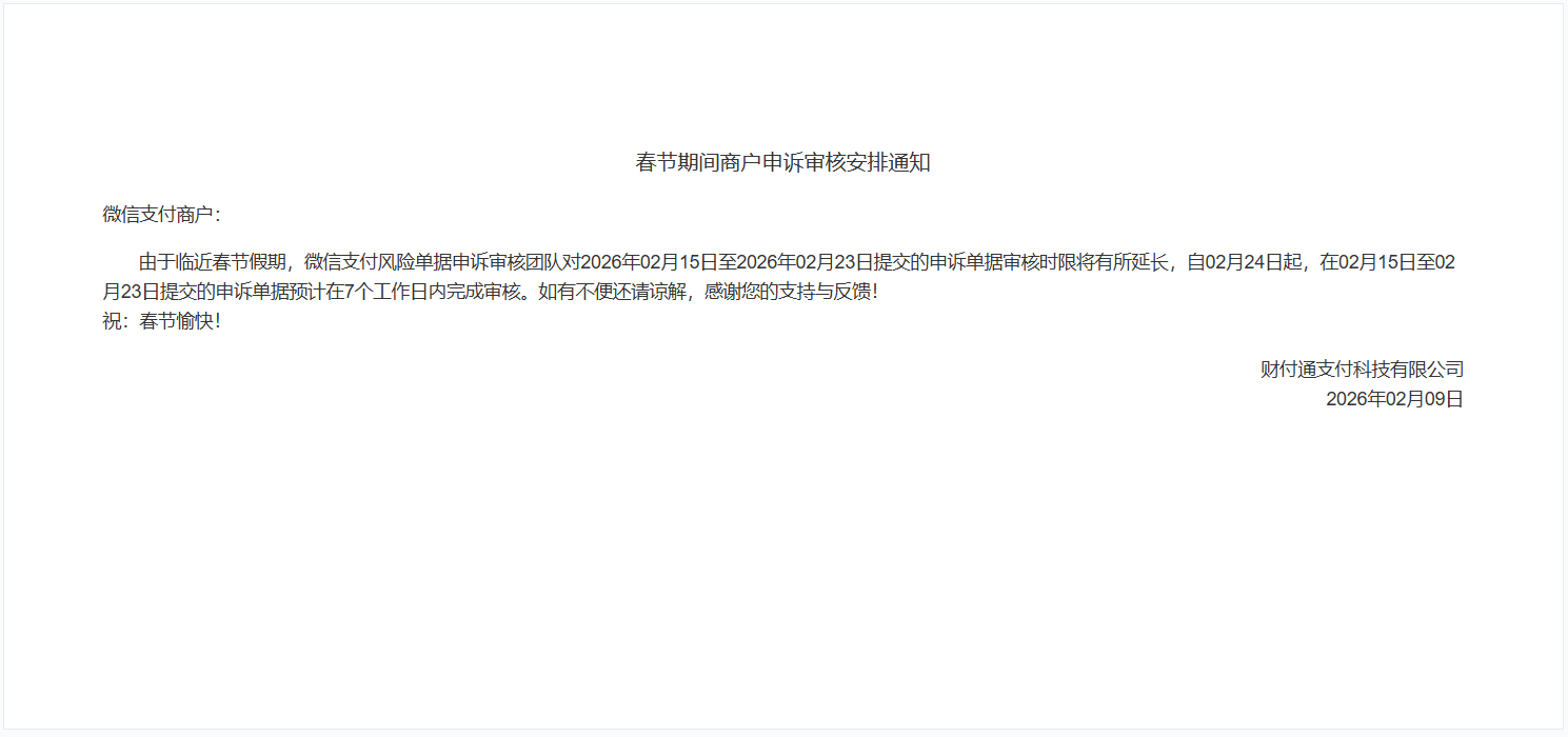 2月9日,财付通发布春节期间商户申诉审核安排通知。通知称,由于临近春节假期,微信支付风险单据申诉审核团队对2026年02月15日至2026年02月23日提交的申诉单据审核时限将有所延长,自02月24日起,在02月15日至02月23日提交的申诉单据预计在7个工作日内完成审核。