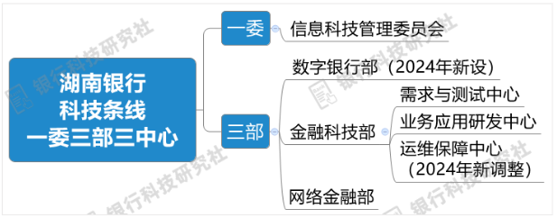 湖南银行2024年报显示,在科技条线,该行已经设立了“一委三部三中心”,包括:信息科技管理委员会,数字银行部、金融科技部、网络金融部。金融科技部下设需求与测试中心、业务应用研发中心、运维保障中心。
